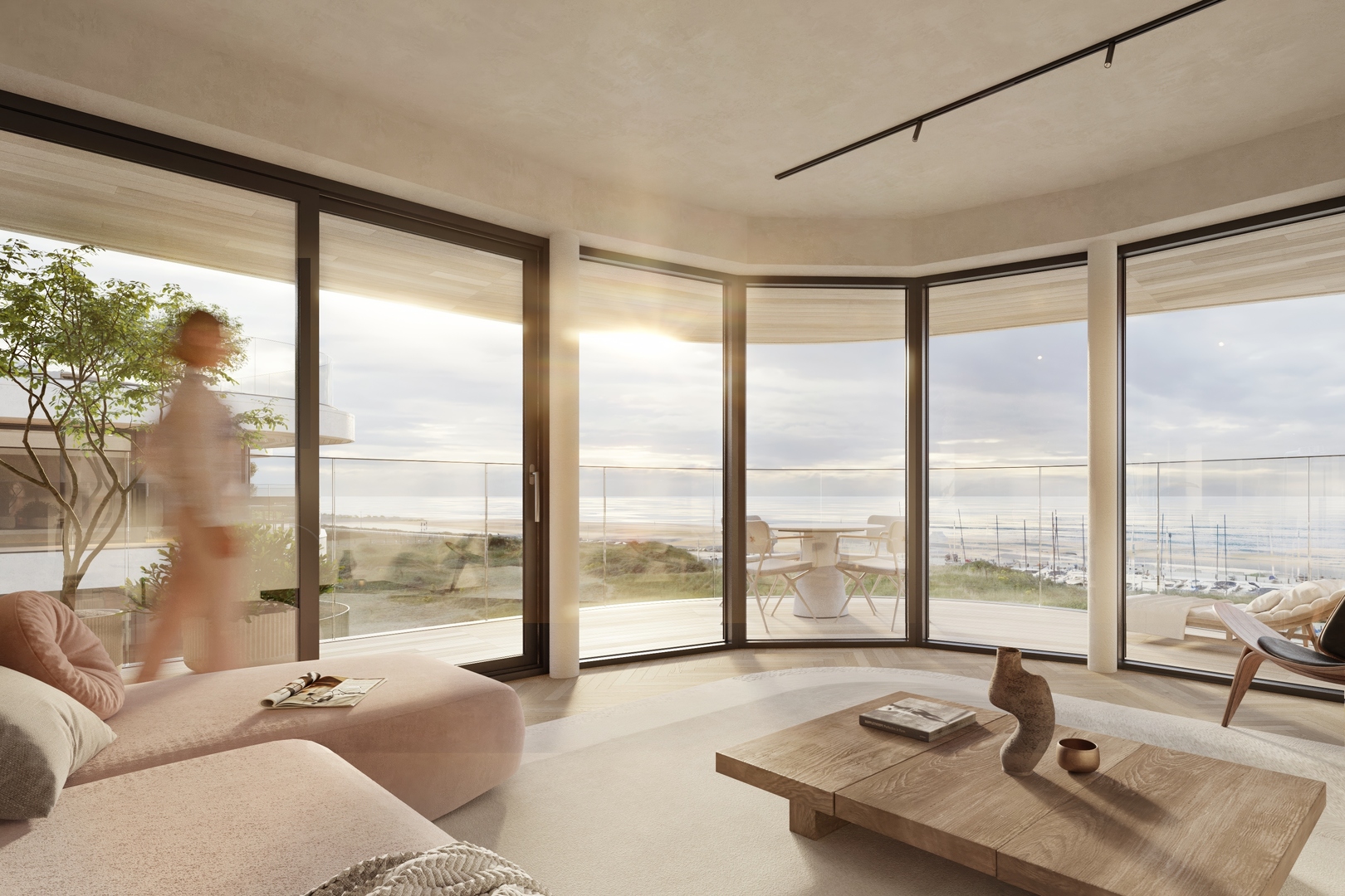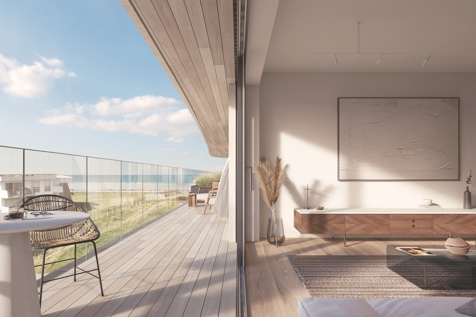 Chaque appartement, quel que soit l’étage, offre une vue sur la mer, les dunes ou les deux. Les surfaces habitables varient de 53 m² à 101 m², complétées par des terrasses généreuses allant jusqu’à 69 m². Selon le type, les appartements disposent de deux à trois chambres et d’une ou deux salles de bains.